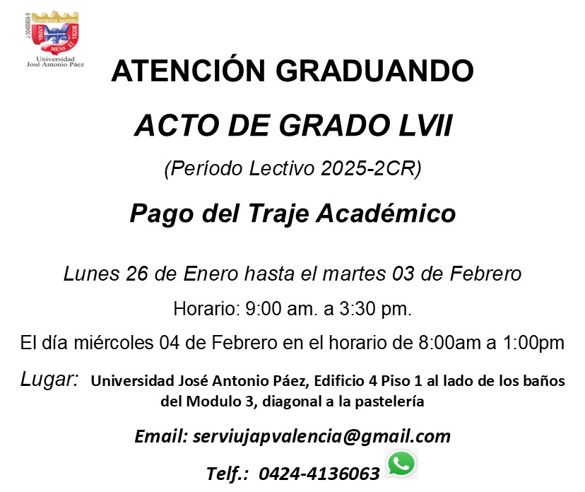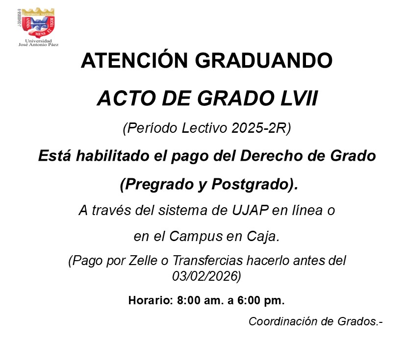 AL IGUAL COMO SE HA REALIZADO EN LOS ACTOS DE GRADO ANTERIORES, SE EXHORTA A LOS GRADUANDOS DEL ACTO DE GRADO ACADEMICO Nº LVI, QUE SOLO ESTA AUTORIZADO EL ACCESO AL CAMPUS UNIVERSITARIO EL DA 06-02-2026 DE DOS (2) ACOMPAÑANTES POR GRADUANDO. SIN EXCEPCIN, NO SE PERMITIR EL INGRESO A MENORES DE 12 AÑOS, AS COMO DE INVITADOS Y FAMILIARES QUE NO ESTEN DEBIDAMENTE AUTORIZADOS. Si este fuera el caso debe tomar las medidas necesarias para evitar situaciones incomodas. ACTO GRADO ACADEMICO Nº LVII SOLO DOS (2) ACOMPAÑANTES POR GRADUANDO. SIN EXCEPCION PAGO DEL DERECHO DE GRADO A MAS TARDAR EL 03/02/2026 ATENCION Ver --- > Firma del Libro del Acto de Grado Académico LVII 04/02/2026 Ver --- > Distribucin del Acto de Grado Académico LVII 06/02/2026 | |
